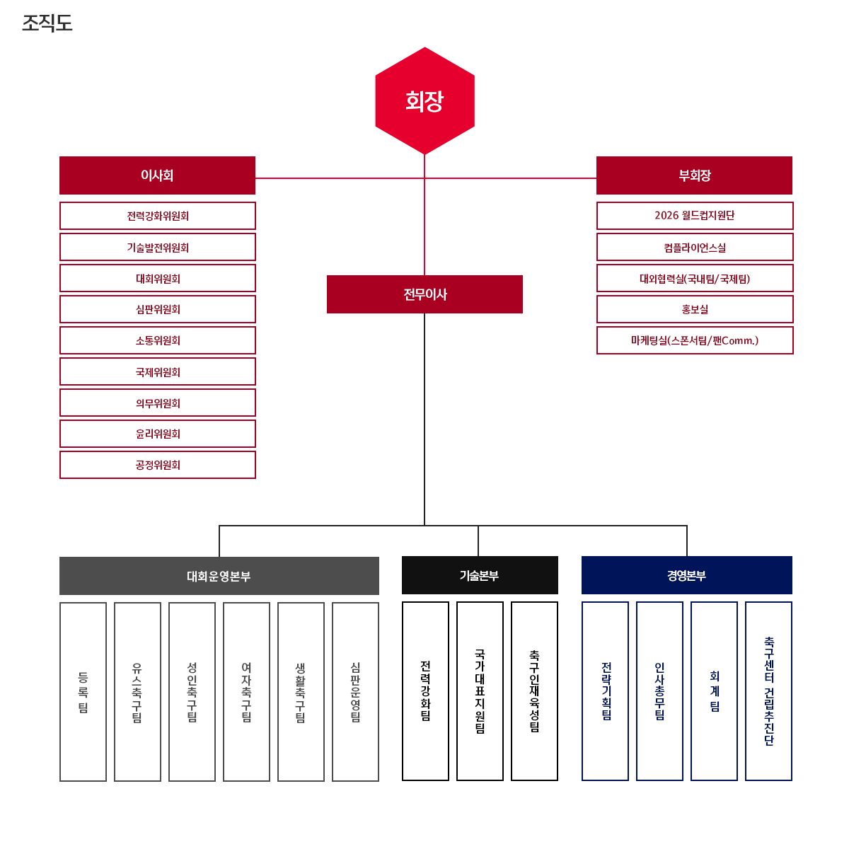 - 인사·노무 관리, 평가·교육 운영 - 물자, 시설, 차량, 항공, 현물 등 자산 및 행정 관리 - 축구회관 운영 및 이전 지원, 유관기관 협력 - IT 시스템 및 자산 운영, 전산 지원 및 기획 - 구매·입찰·정산 등 회계 지원성 행정 처리 - 임원 지원 |